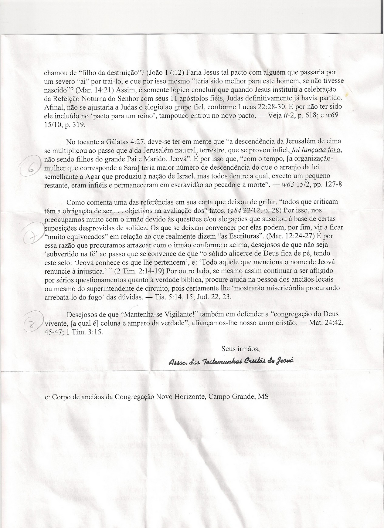 Para os irmãos que estão lendo esta carta, espero sinceramente que tenham suficiente amor a Jeová e à sua Palavra para considerar os fatos apresentados na carta que enviei à Associação. Espero que não tenham medo de ler os artigos que o próprio Corpo Governante já escreveu e que uma vez colocados de forma organizada evidenciam um lado bastante sombrio da Organização.