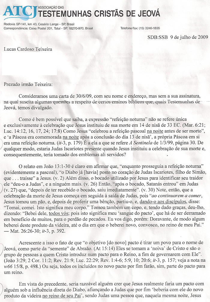 Aliás, os senhores de Betel enviaram aos irmãos uma cópia da carta que enviaram a mim. Por que não enviaram também uma cópia da carta que eu enviei a Betel? Com certeza não queriam que os irmãos vissem o que pesquisei, somente a resposta que me deram, podendo desta forma distorcer livremente o que eu disse, como podem agora verificar.