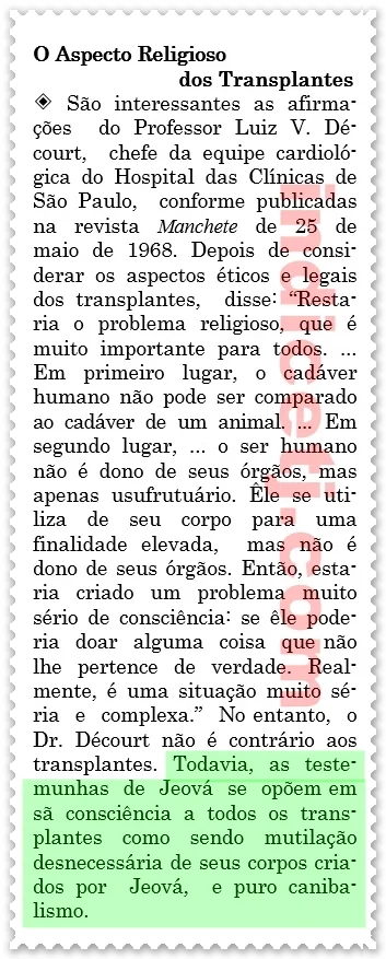 A remoção cirúrgica de um órgão de um corpo humano para outro corpo humano, com o objetivo de SALVAR VIDAS, era chamado pelo Corpo Governante de MUTILAÇÃO DESNECESSÁRIA!